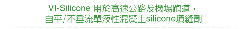 VI-Silicone適合用於混凝土結構之水平或垂直性的黏結,並可適用於金屬或大部分其它的工程材料之填縫劑,並能忍受長時間的震動或移動及天氣溫度的變化。最適合做為高速公路及機場跑道的填縫料。
