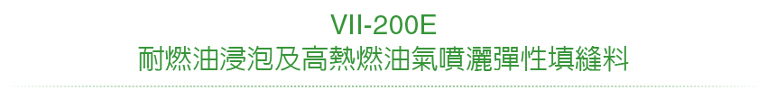 VII-200E填縫料為兩液型、自平性、冷拌式、抗噴射燃油之硫化橡膠填縫料。本填縫料具有絕佳的抗撕裂性及彈性,適用於板塊擴孔後填縫。其材質在彈性回覆度上有良好的特性,在板塊擠壓或擴張後仍維持原有之黏結狀態。